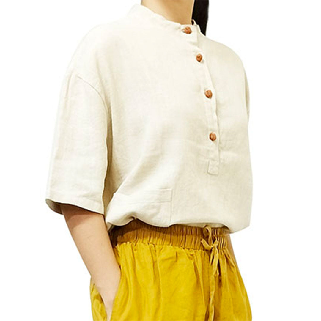 2025 New cotton-linen women's clothing, linen stand-collar color-blocking button-up pullover, plus-size women's cotton-linen shirt