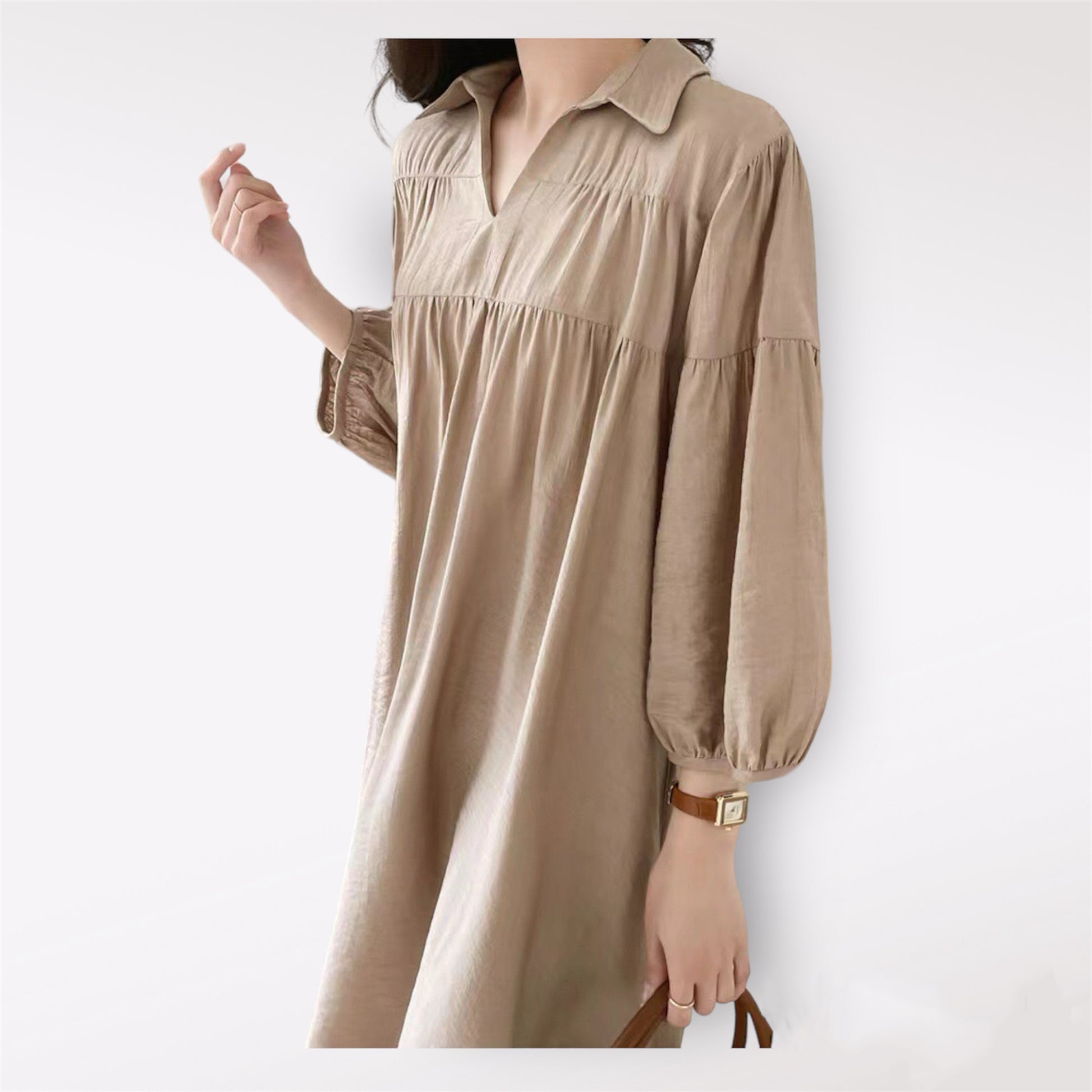 Korean Chic Loose Fit Lantern Sleeve Dress with V-Neck and Waist Tie, Long Sleeve Women’s Midi Dress