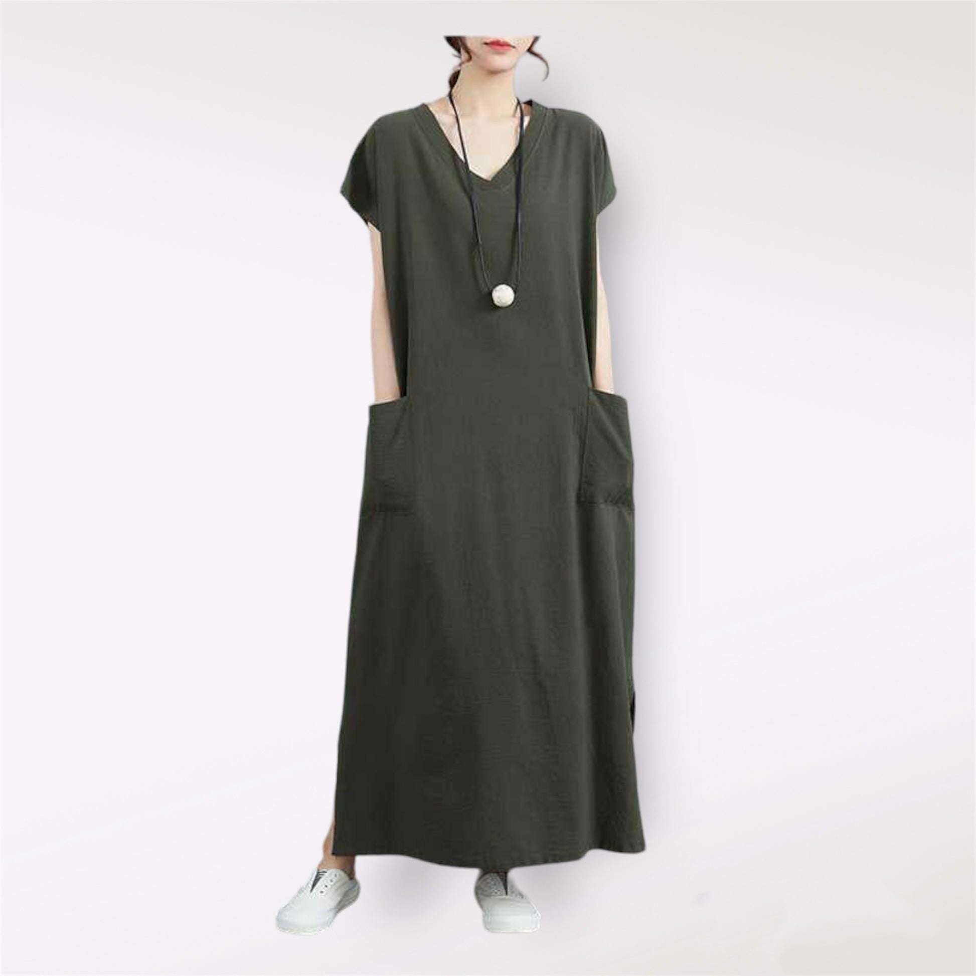 New Retro Cotton Linen V-Neck Plus Size Loose Fit Dress with Pocket Design and Short Sleeves