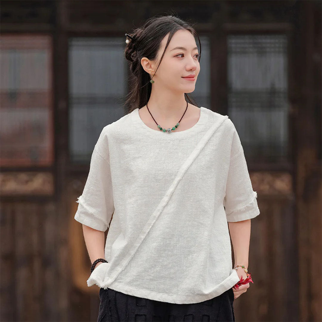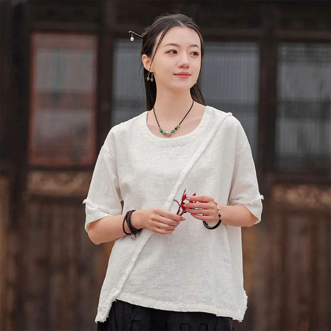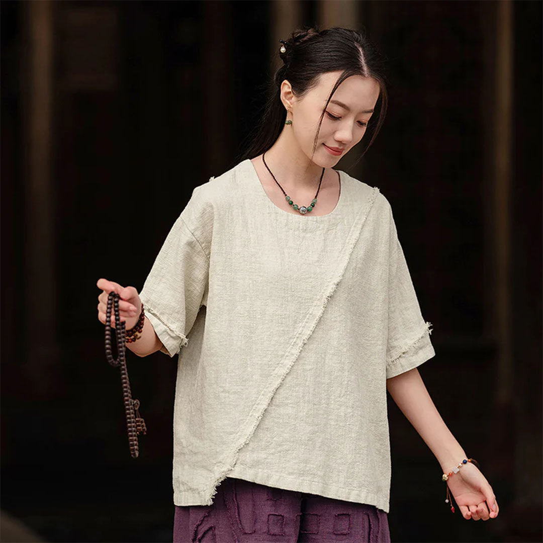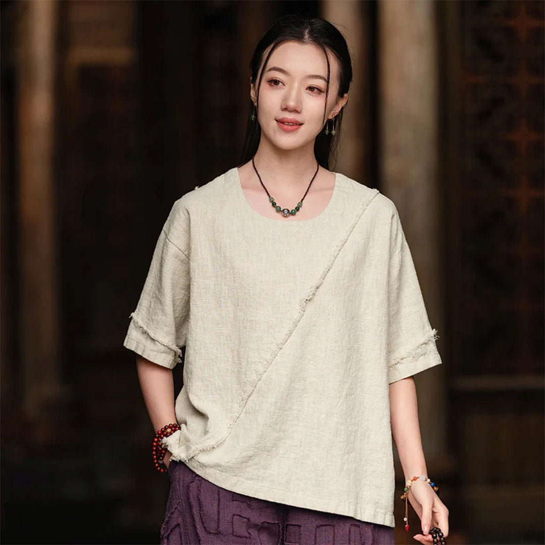 Crafted from breathable ramie and cotton-linen blend, this asymmetrical short-sleeve T-shirt is designed for comfort and individuality. The sand-washed finish gives it a soft, vintage texture, while the loose fit and irregular hemline add a touch of artistic flair. Perfect for those who value style with personality.
