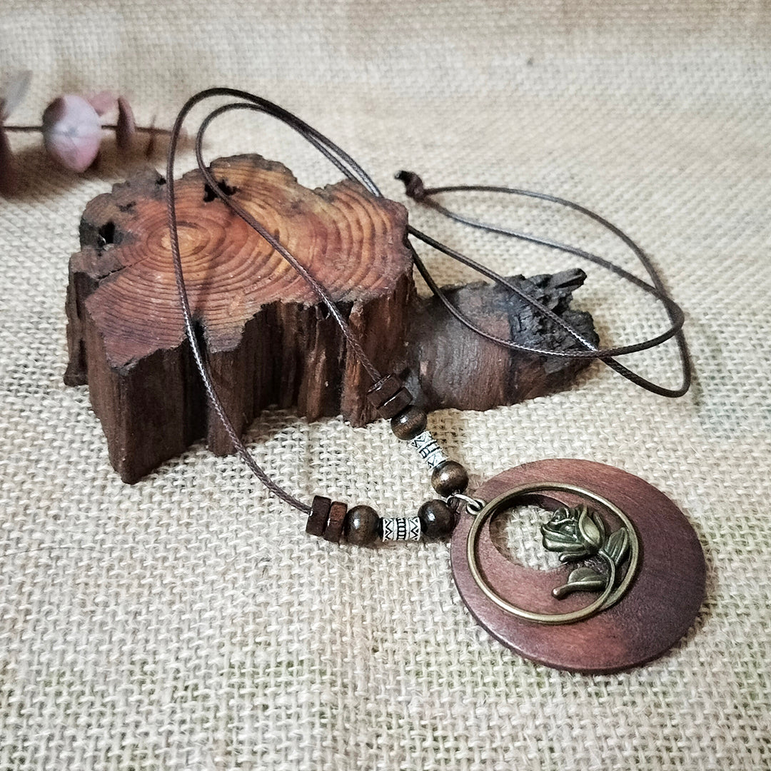 Vintage Ethnic Style Beaded Wooden Hollow Pendant Necklace (Rose)