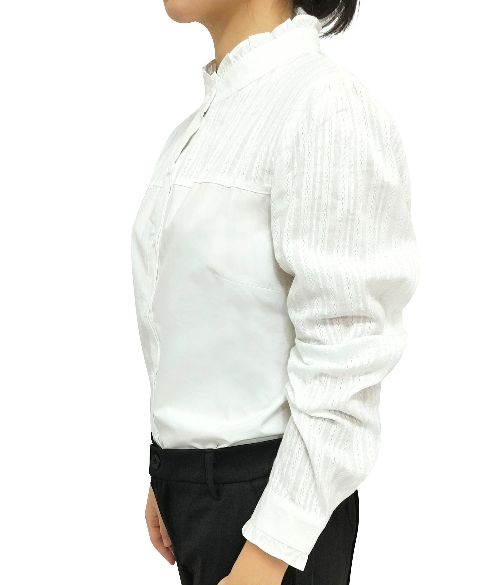 Women’s Long Sleeve White Shirt: Striped Design, Slim Fit, Cotton Base Blouse with Ruffled Collar